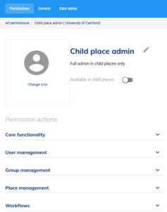 Any number of permission sets can be defined, and they are fully bespoke. Permission sets enable the central IT department to delegate without surrendering visibility or control. The screenshot below shows the permission set assigned to administrators of child places within this organisation.
